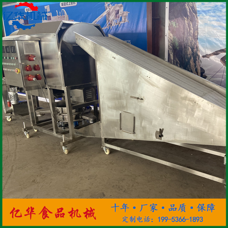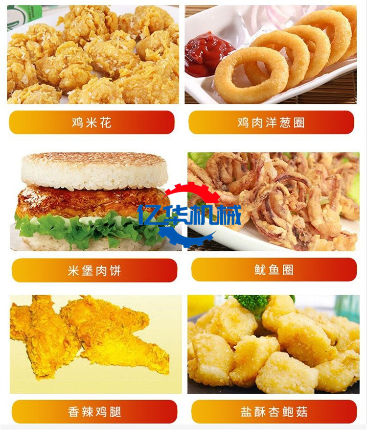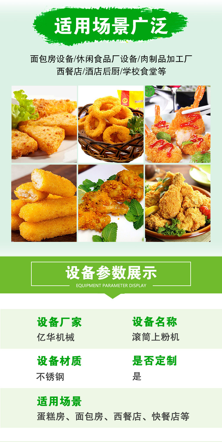 滾筒上粉機(jī)通過滾筒的轉(zhuǎn)動(dòng),將產(chǎn)品表面裹上一層均勻的裹粉,以增加產(chǎn)品的上粉量,產(chǎn)生鱗片狀的形態(tài)。適用于塊狀、條狀物料的上粉(面包屑),如:雞米花、雞柳條、雞塊、魚塊、琵琶腿、香辣翅根等。